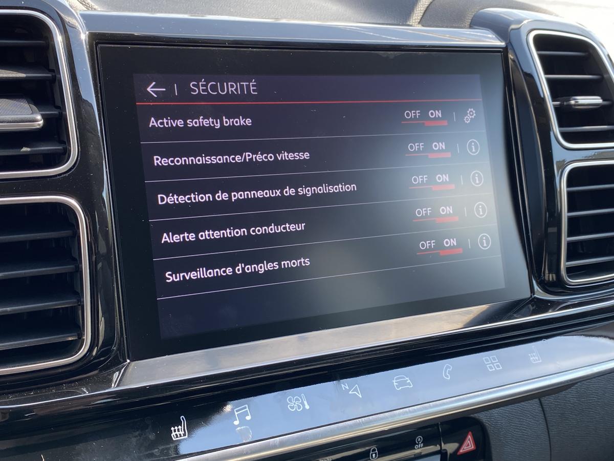 3 sièges arrière indépendants, coulissants, inclinables et escamotablesAérateurs en rang 2Accès et démarrage mains-libresActive Safety Brake+ (Pack Safety +)Aide au démarrage en penteAide au stationnement avant / arrièreAlerte Active de Franchissement Involontaire de Ligne (AAFIL)Allumage automatique des feux de croisementCaméra de recul avec Top Rear VisionCITROËN Connect Nav + CITROËN Connect Box avec Pack SOS et assistance inclusClimatisation automatique bizoneCombiné numérique 12,3" personnalisableCommandes au volantContrôle dynamique de stabilité (ESP)Feux arrière 3D à LEDFeux diurnes à LEDFrein de stationnement électrique automatiqueGarniture cuir grainé Graphite /Tissu Graphite - Ambiance Metropolitan GreyHayon électrique mains libresJantes alliage 19" ART DiamantéesKit de dépannage provisoire de pneumatiquesKit mains libres BluetoothLève-vitres avant et arrière électriques et impulsionnelsMirror ScreenPack ConfortPack Drive Assist +Pack Look Silver anodiséPack SafetyPack Safety +Projecteurs antibrouillard avec éclairage statique d'intersectionProjecteurs Full LEDRétroviseur intérieur électrochromeRétroviseurs extérieurs électriques et dégivrantsRétroviseurs extérieurs rabattables électriquementRadio Numérique DABRecharge smartphone sans filSiège conducteur électrique (Pack Confort)Sièges Advanced ComfortSièges avant chauffants (Pack Confort)Sièges conducteur et passager réglables en hauteurSuspensions avec Butées Hydrauliques ProgressivesSystème de contrôle des angles morts avec assistance activeSystème de fixation ISOFIX aux places latérales arrière et passager avantVitres et lunette arrière surteintéesVolant en cuir MistralVolant réglable en hauteur et en profondeur
